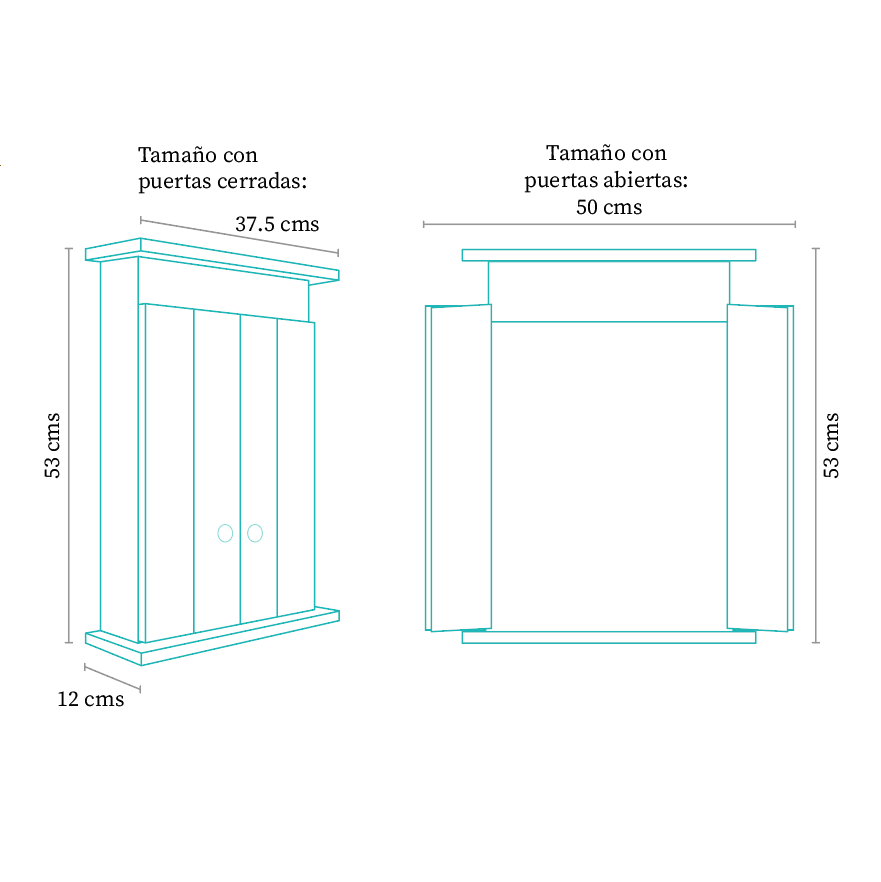 Alto: 53 cm, Ancho cerrado: 37.5 cm, Ancho Abierto: 50 cm, Profundidad: 12 cms